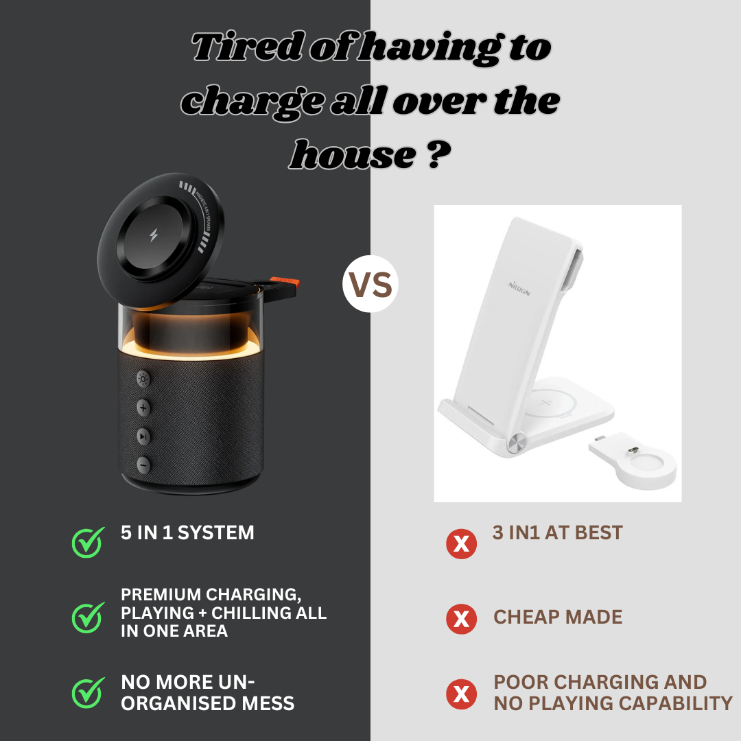 Tired of juggling chargers, tangled wires and dead batteries ruining your vibe ? Met the Scodii™ PowerPod - the revolutionary 5-in-1 magnetic charging station that boasts a premium speaker that can transform desks, nightstands and travel bags worldwide.